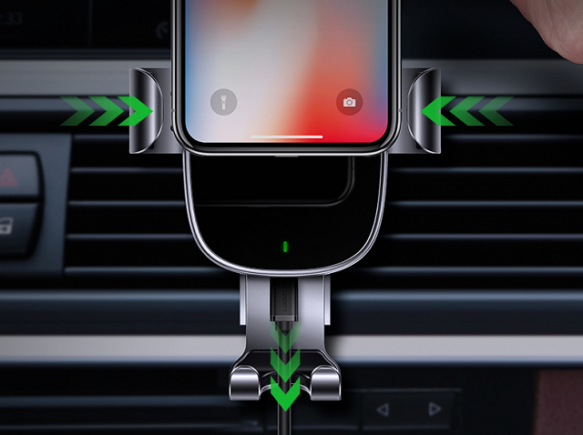 綠聯無線充電支架采用鋁合金外殼和噴砂氧化工藝,外觀呈現高端奢華視效。功能方面運用重力聯動設計,把iPhoneX或iPhone8放上去就可以自動收縮扣緊手機,并且自動識別手機進行無線充電,科技創新感十足。
